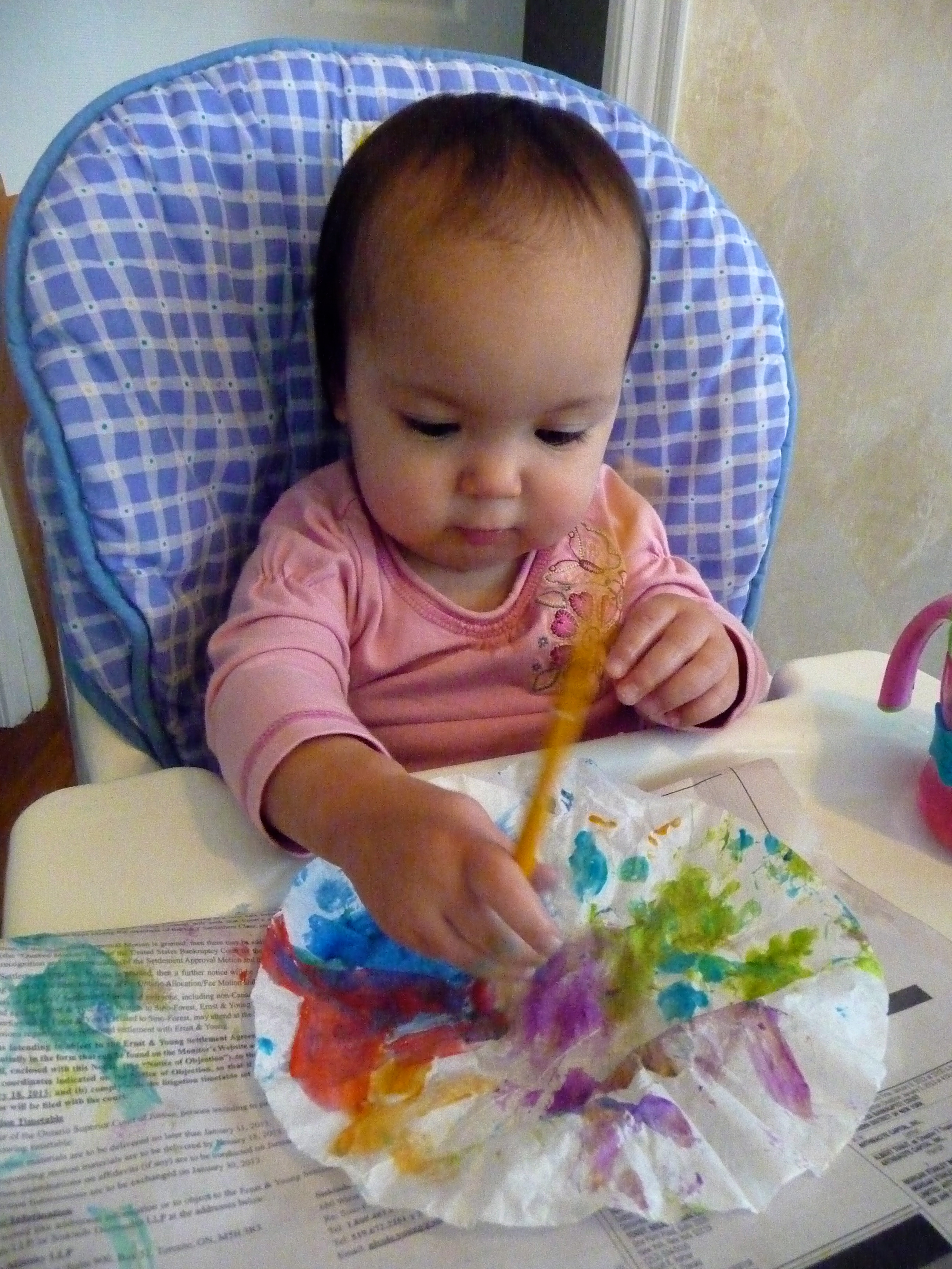 Unfortunately, the blogger who came up with this craft seems to have slipped into a cyberspace black hole. I hate that I can’t link you to the original site, but suffice to say, this craft didn’t originate with me. Still, it’s one of my favorites because it’s cheap, colorful, and easy. First, paint several coffee filters with watercolors. Then, after they dry, cut out a variety of fun shapes and objects. Use double-sided tape to stick the shapes to a glass door or window. The original blogger taped a construction paper tree trunk to the door, and put the painted shapes (mostly leaves, flowers, and snowflakes) all around. She even bought acrylic paint and let her older kids paint details around the “tree” directly onto the glass door! The end result is a festive door (or window) sure to bring smiles from passersby 🙂