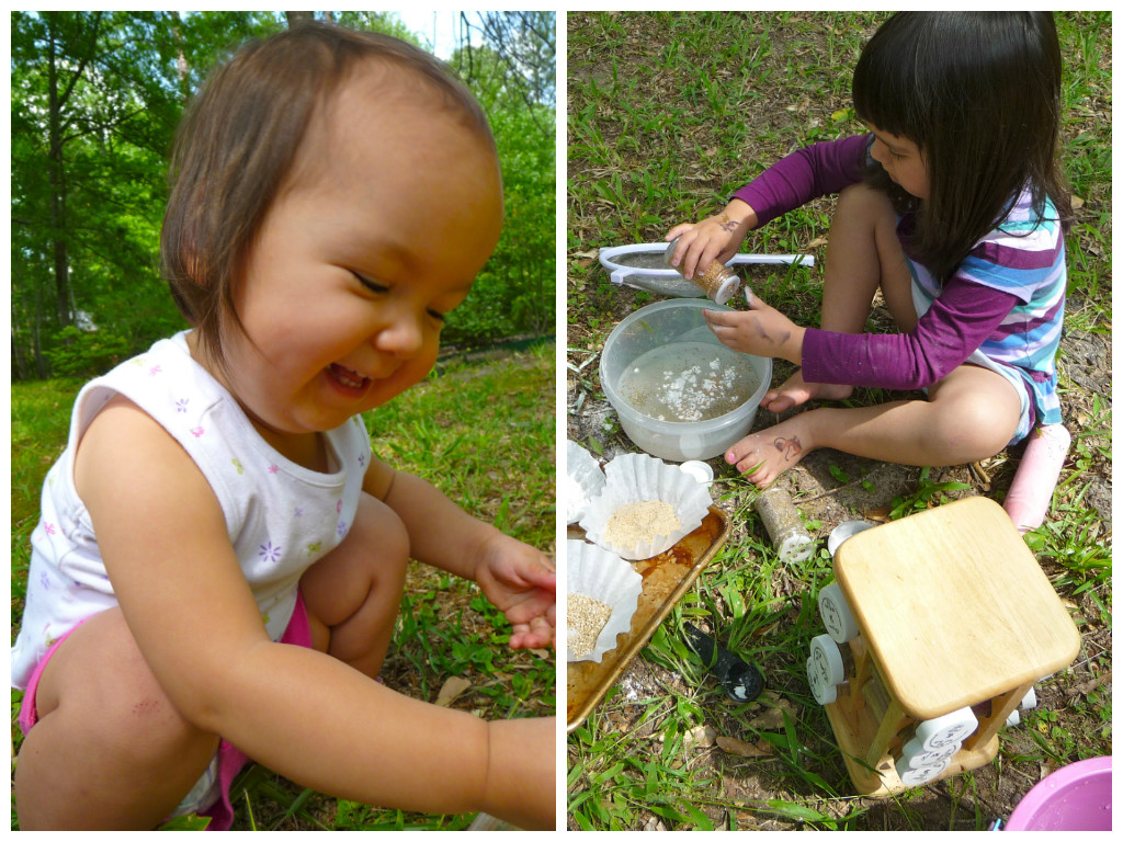 A great outdoor activity for a boring afternoon! Gather one big bowl per child, a handful of creative kitchen utensils, all your old spices and whatever other pantry items you don’t mind “wasting.” (I filled coffee filters with things like oatmeal, coffee grounds, and flour so after we made a big mess we could just throw it all away.) Remember grass, dirt, flowers, and rocks also make great ingredients for imaginary soup. More details at One Perfect Day.