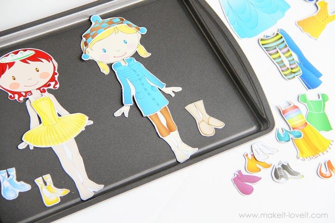 Supplies: Adhesive Magnetic Sheets, a book of pre-cut paper dolls OR card stock and markers, scissors, cookie sheet