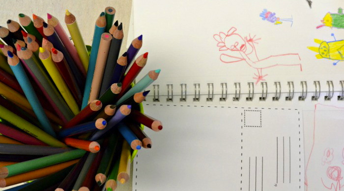Supplies: several sheets of kids’ artwork, scissors, glue