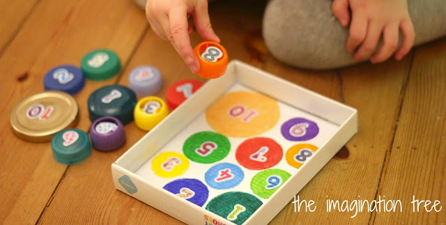 Supplies: variety of bottle tops, box lid, markers, 2 sets of stickers with numbers on them